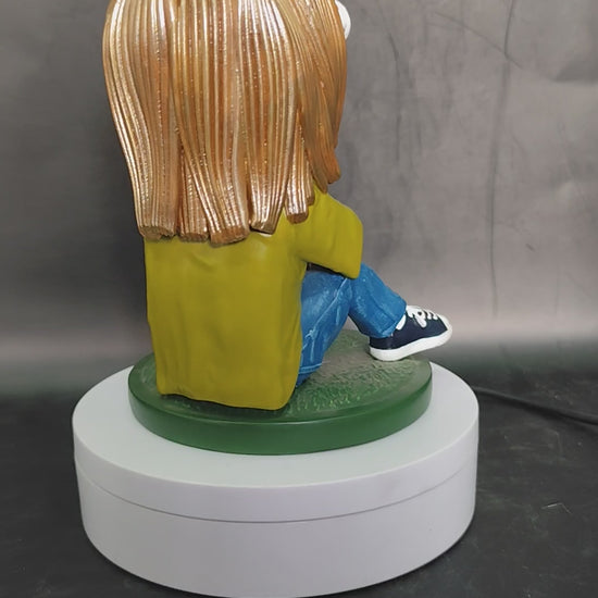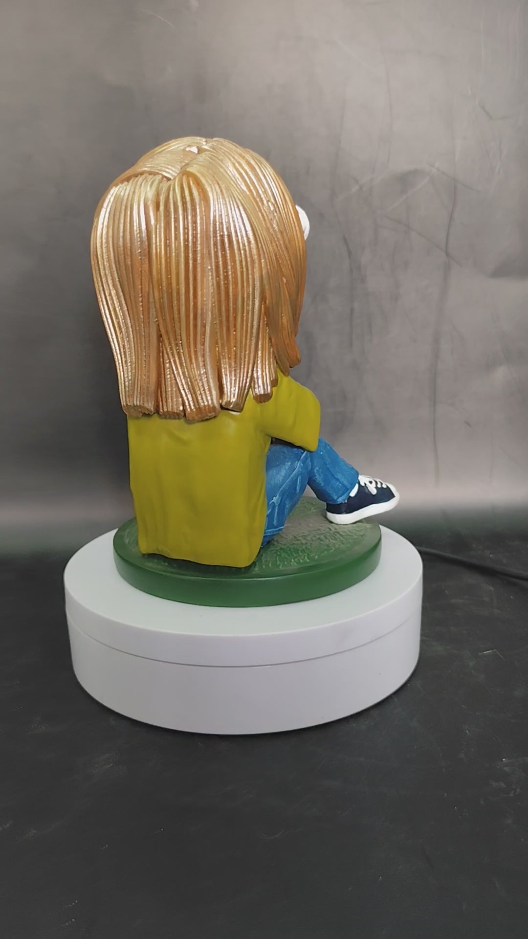 Rinde homenaje al ícono del grunge con esta figura caricaturizada de Kurt Cobain, inspirada en su icónica foto sentado y con sus famosos anteojos. Hecha en resina de alta calidad y pintada a mano, captura su esencia única, su estilo rebelde y la personalidad que lo convirtió en una leyenda del rock.